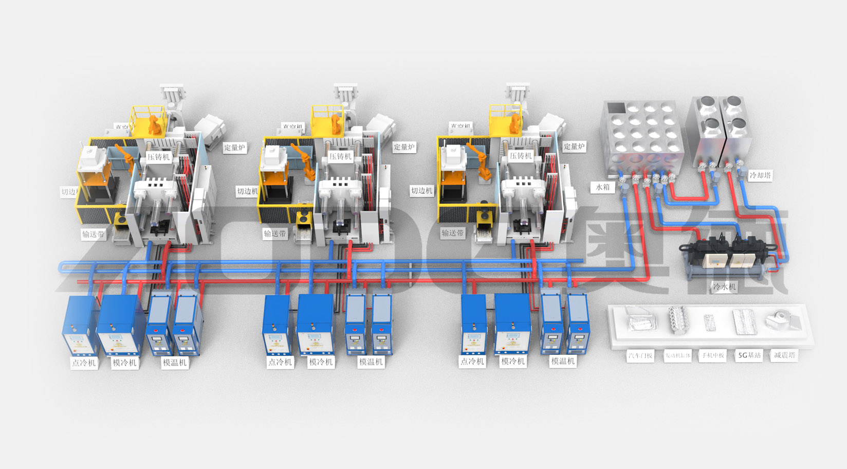 2.壓鑄溫控島一站式交付:模溫機(jī),點冷機(jī),模冷機(jī),冷水機(jī),純水機(jī),模具管道清洗機(jī).